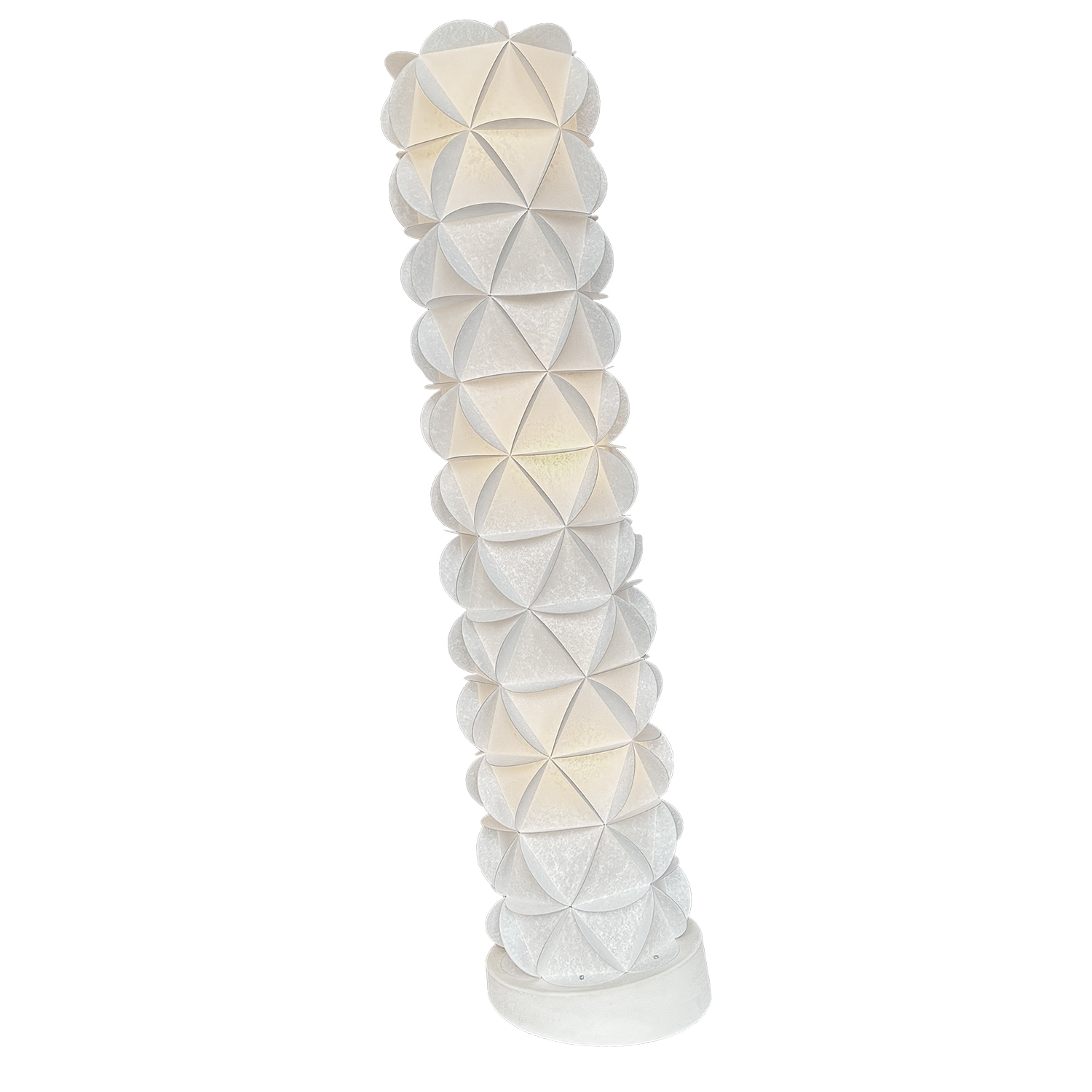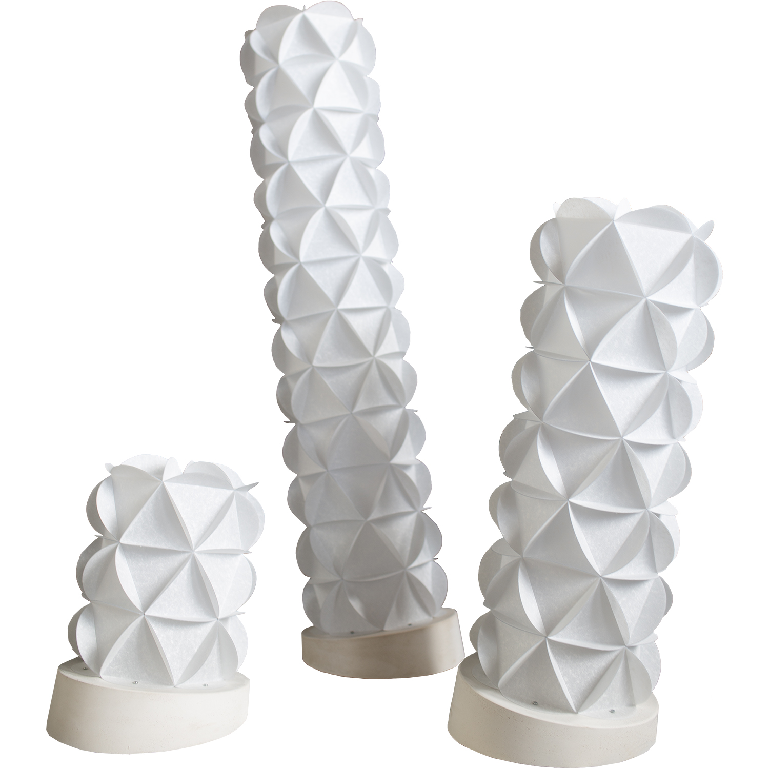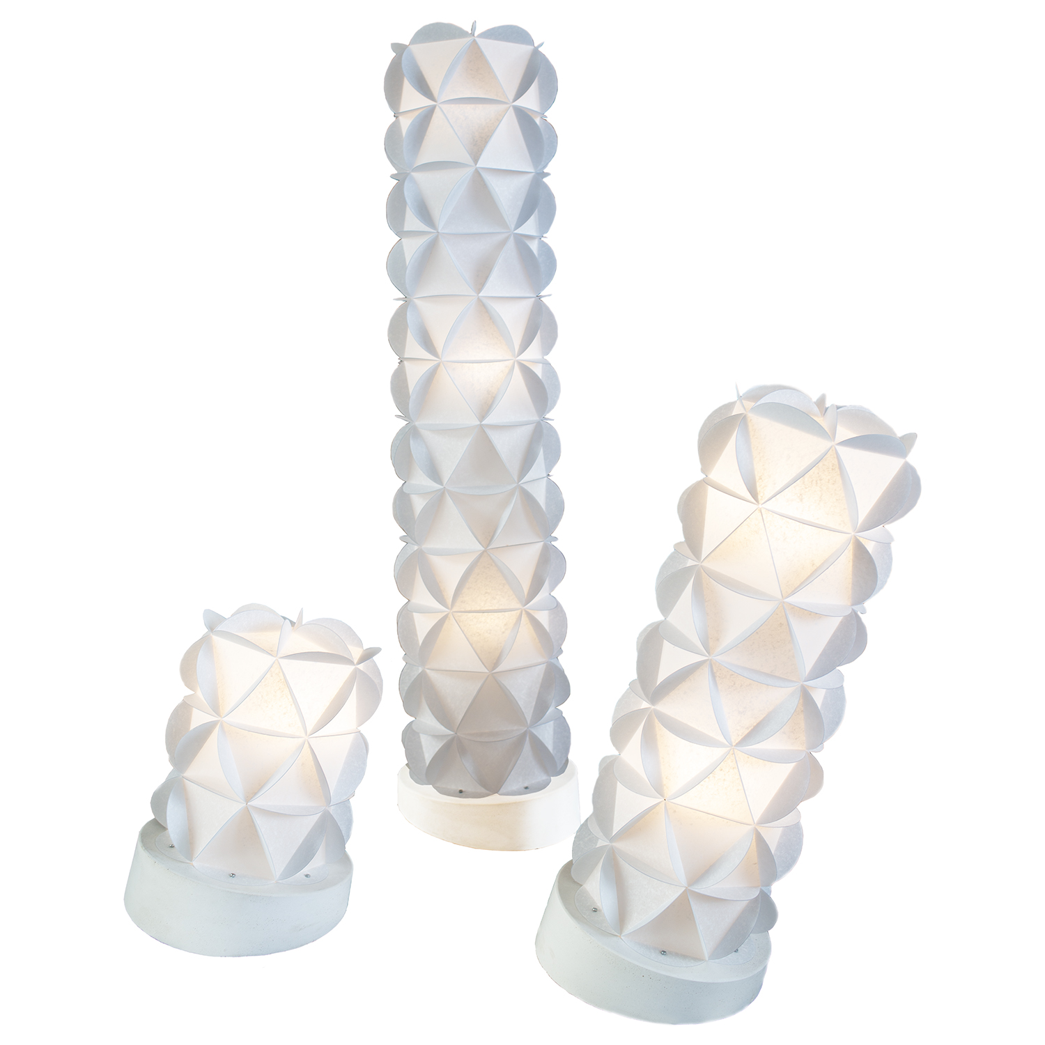 Les colonnes lumineuses Mikado sont des créations sur mesure à partir des matières de la collection Alcove. Leur effet penché permet des mises en scène insolites, inspirées de la nature, comme celle du jardin de cactus d’Ischia.