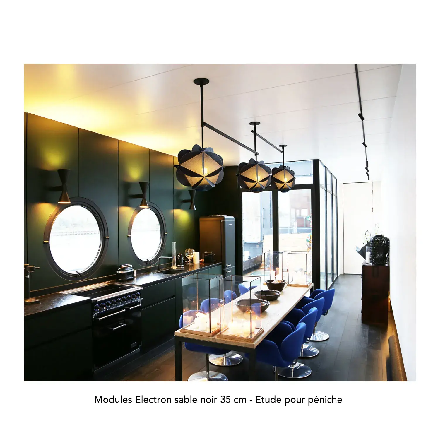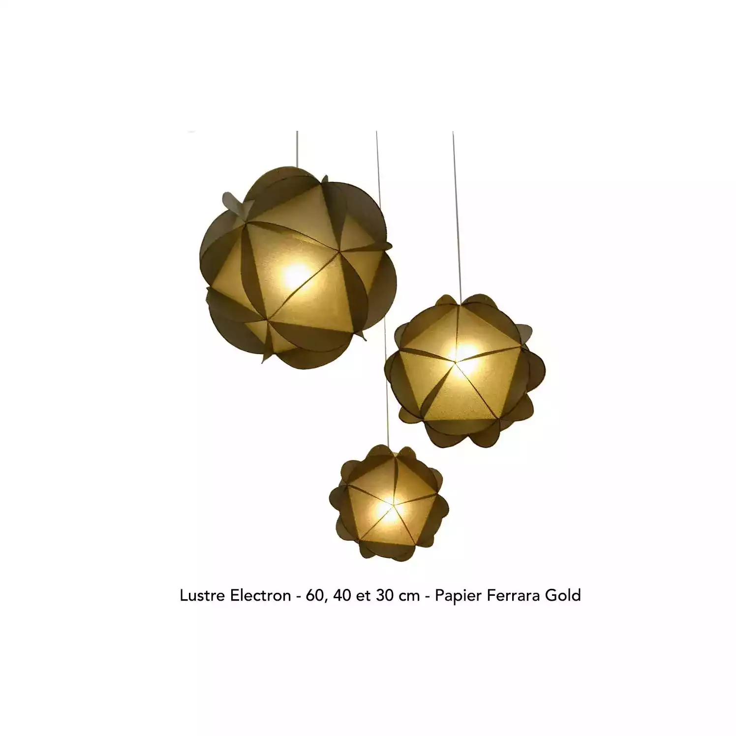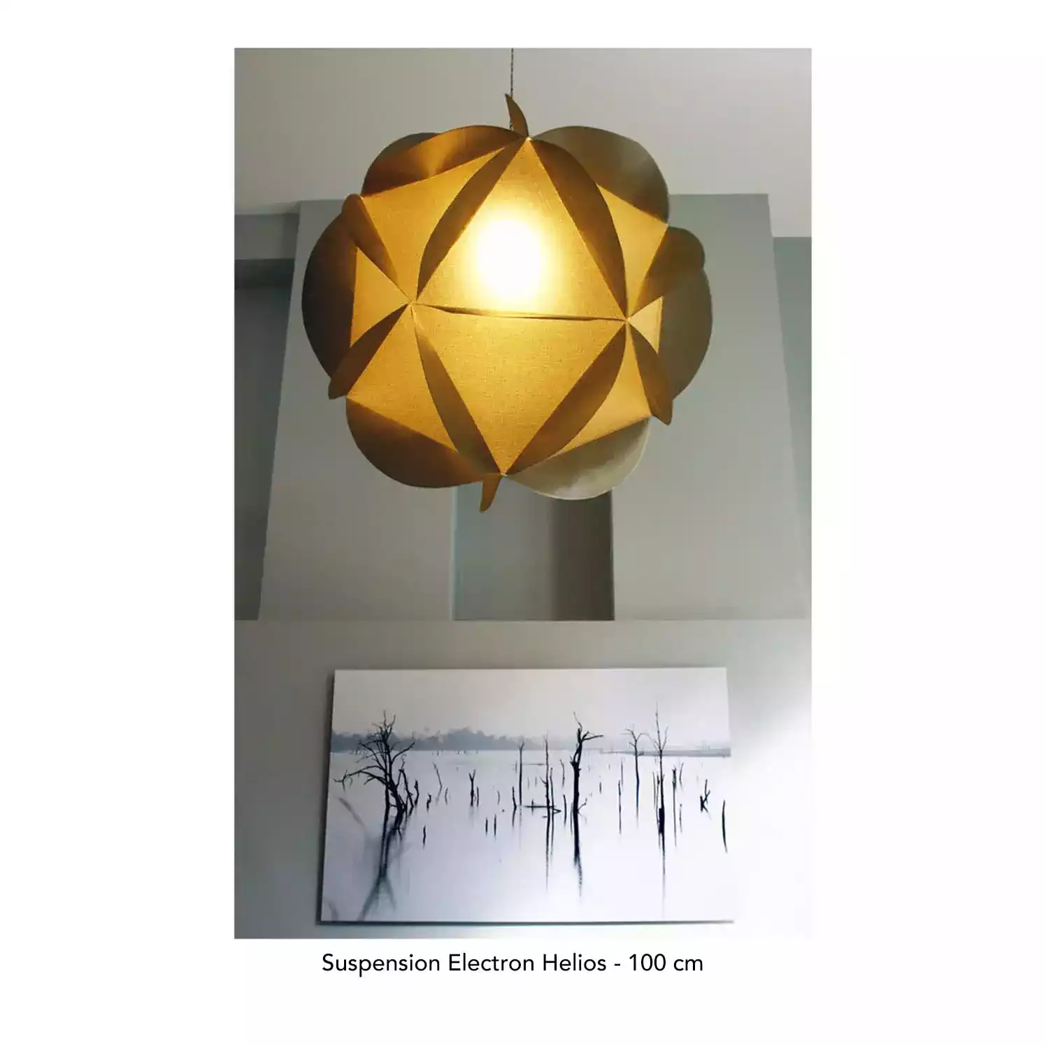 Les suspensions Electron sont le complément design des pièces uniques formées par l’assemblage des modules Alcove : Prenez un rond. Pliez le en triangle. Assemblez en 20 pour obtenir un isodécaèdre, montage bien connu des instituteurs du 20ème siècle! La suite appartient au choix des matières et l’art de la finition des créations d’Anne-Pierre Malval : le but n’est plus la fantaisie des nuages mais la rigueur de la sphère et la composition de ses répétitions