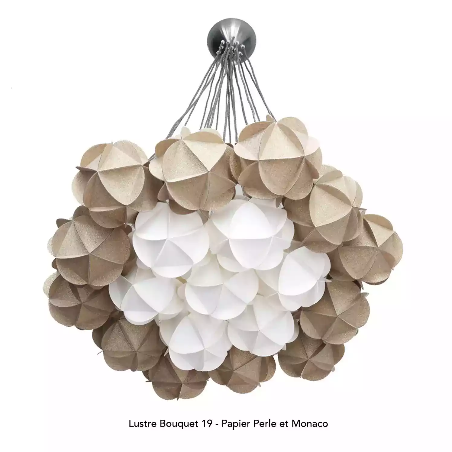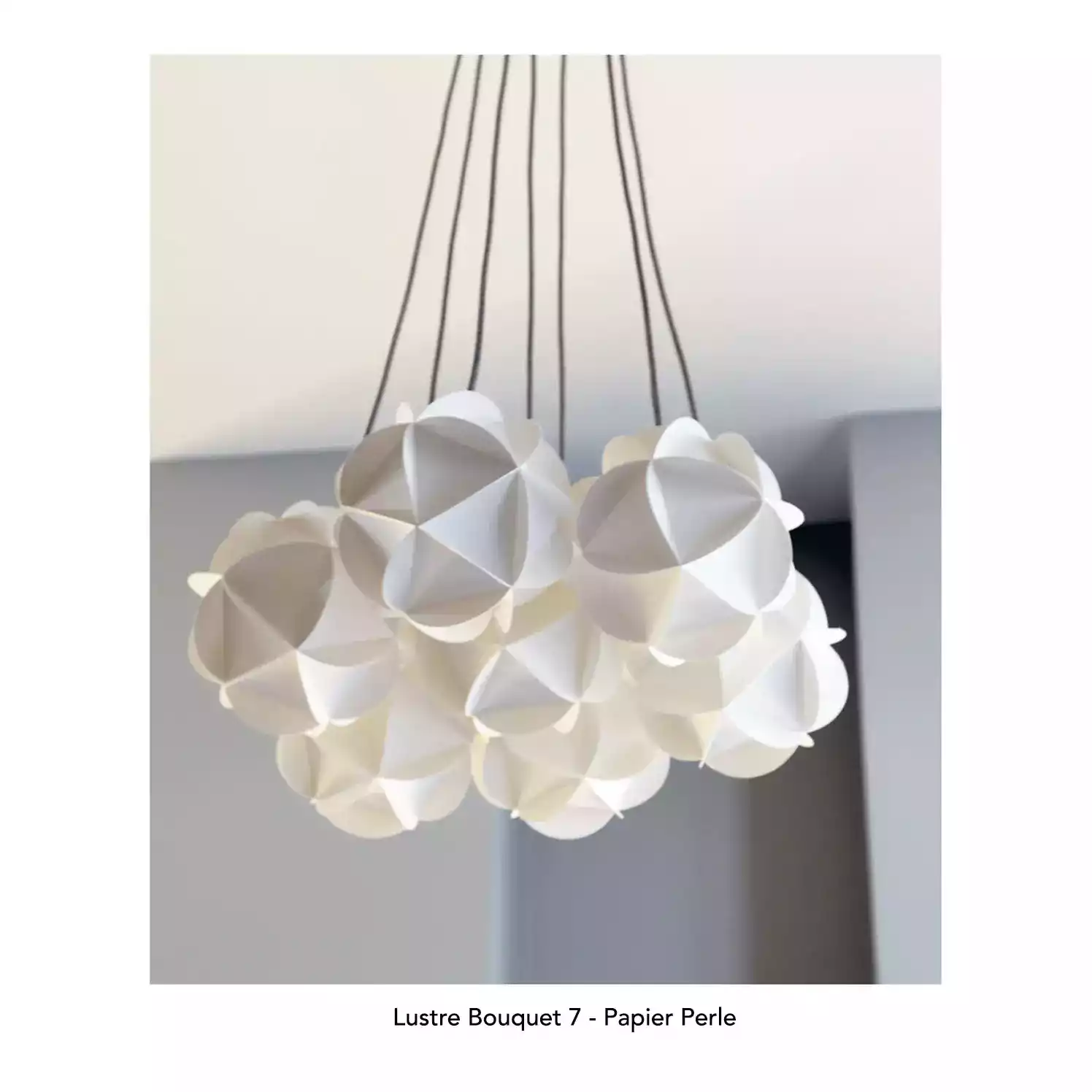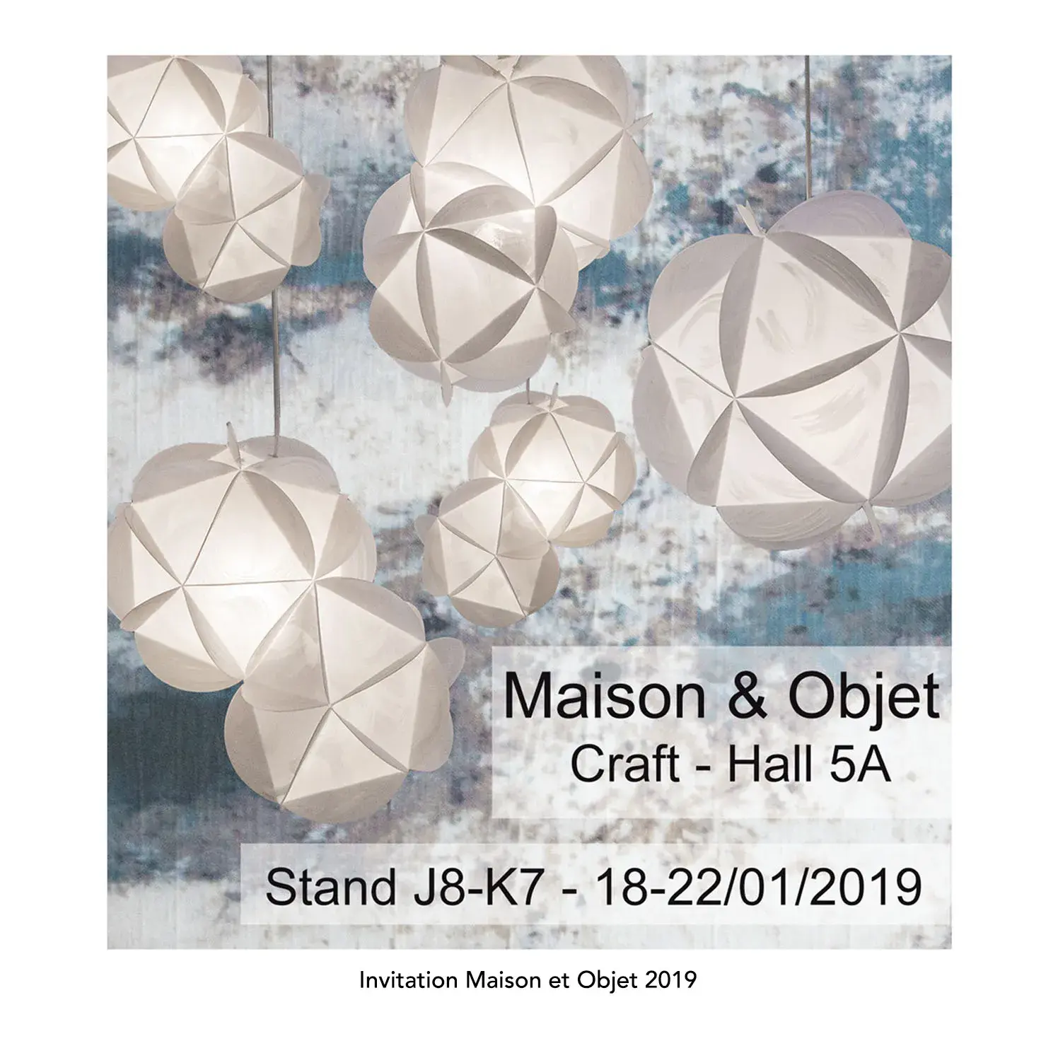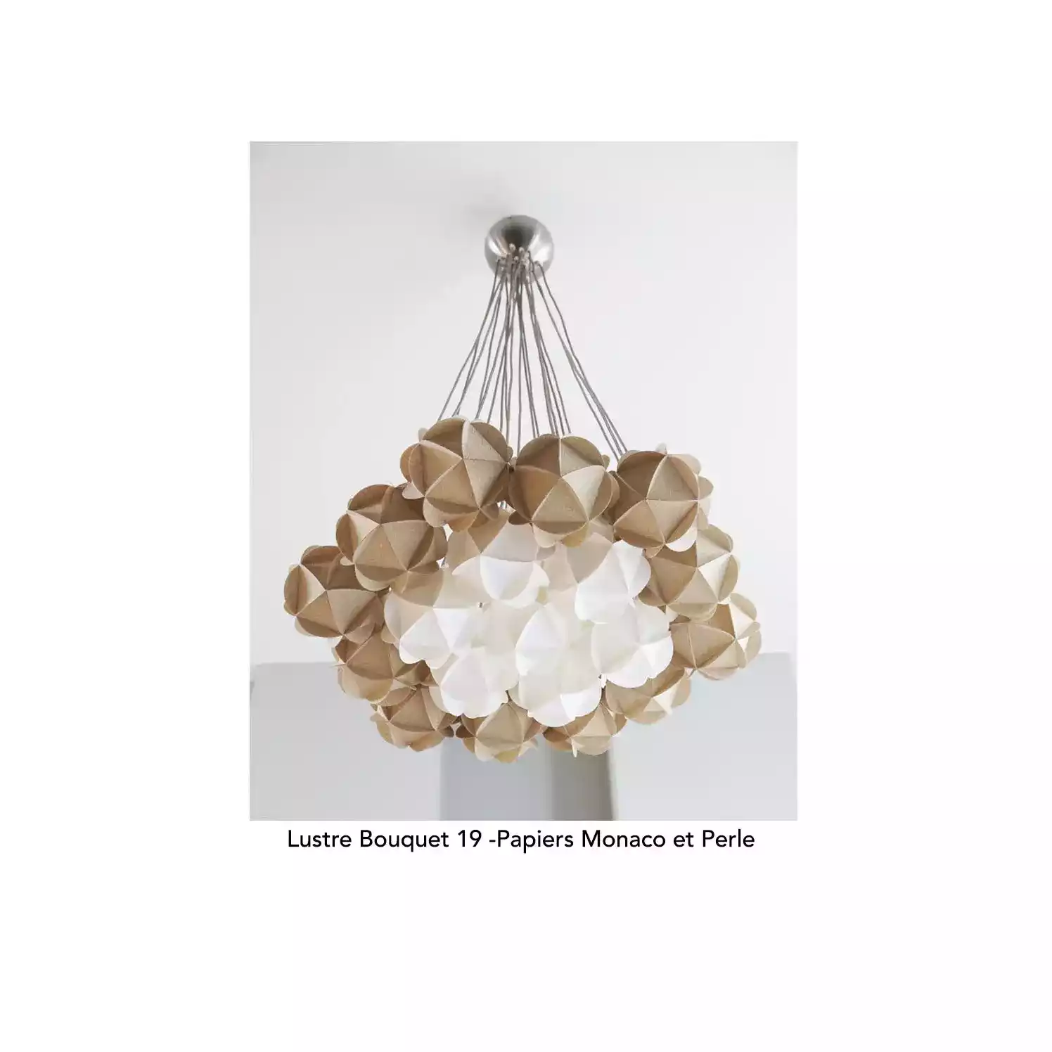 Les suspensions Electron sont le complément design des pièces uniques formées par l’assemblage des modules Alcove : Prenez un rond. Pliez le en triangle. Assemblez en 20 pour obtenir un isodécaèdre, montage bien connu des instituteurs du 20ème siècle! La suite appartient au choix des matières et l’art de la finition des créations d’Anne-Pierre Malval : le but n’est plus la fantaisie des nuages mais la rigueur de la sphère et la composition de ses répétitions