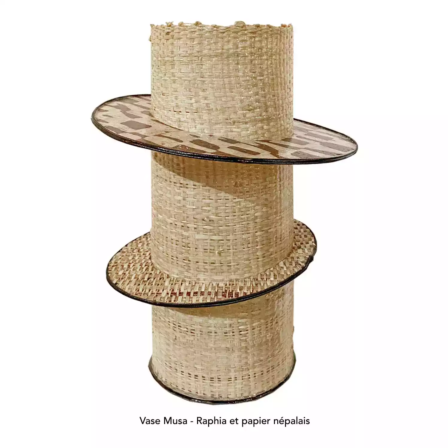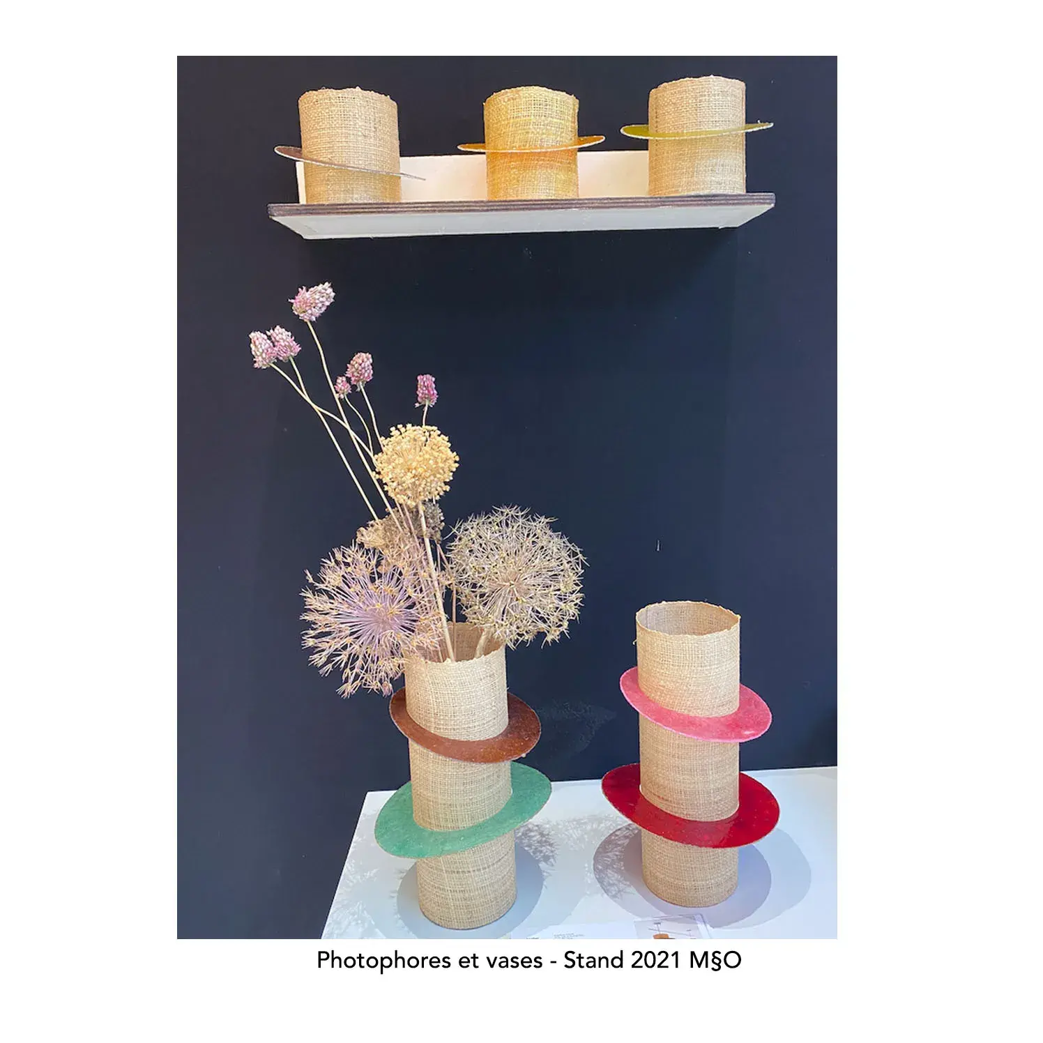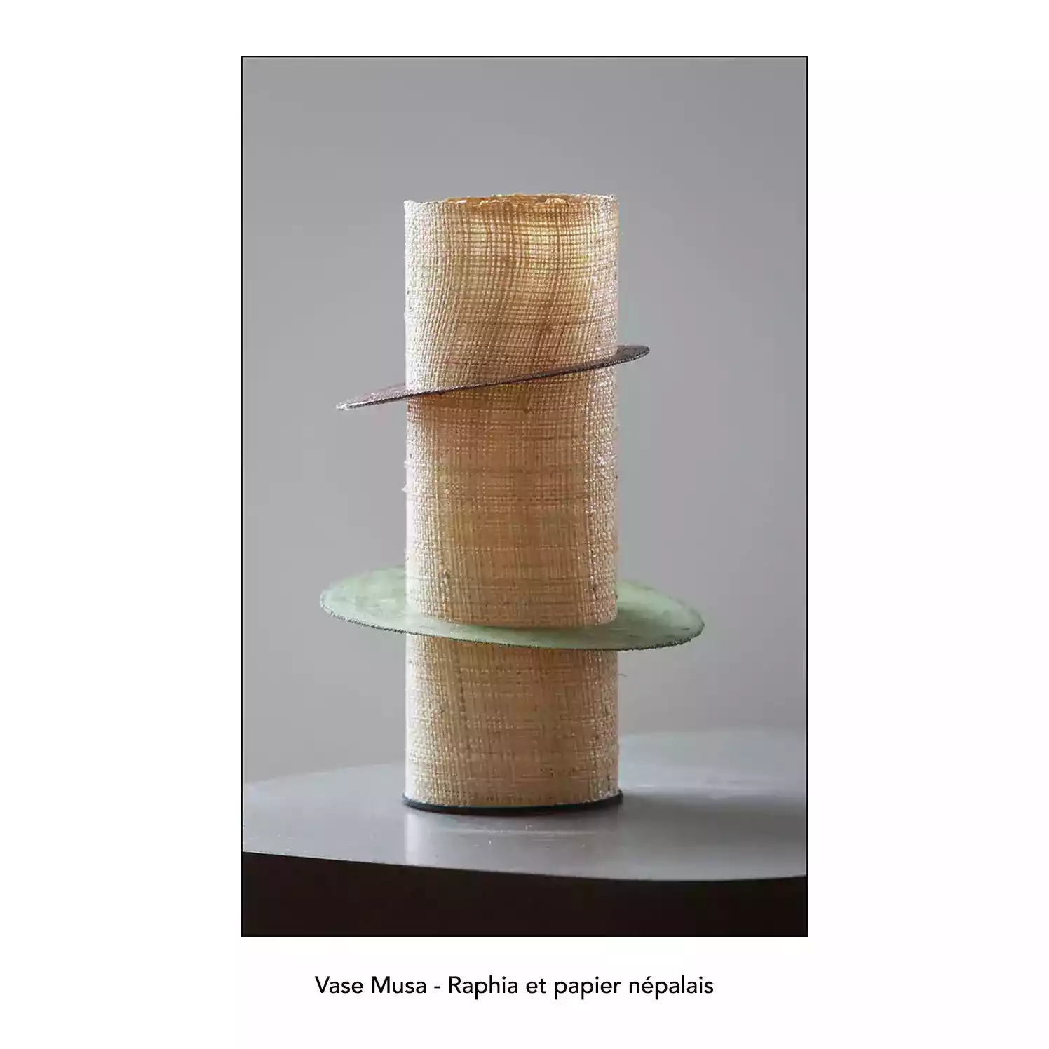 Les vases et photophores Musa reprennent le design des luminaires colonne et lampe à poser avec des tubes en raphia et des corolles de papier népalais. Une résine époxy assure l’étanchéité et une terrine adaptée en permet un nettoyage facilité.